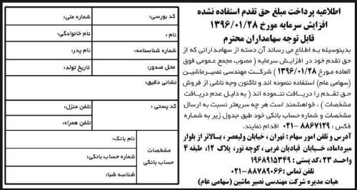 اطلاعیه پرداخت مبلغ حق تقدم  شرکت مهندسی نصیر ماشین  افزایش سرمایه