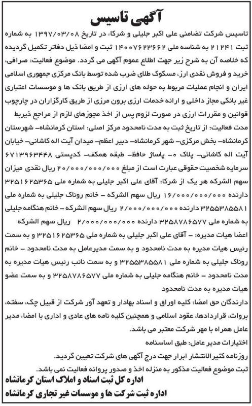 آگهی تاسیس چاپ شده در روزنامه تاسیس شرکت تضامنی علی اکبر جلیلی و شرکاء درتاریخ ۰۸/۰۳/۱۳۹۷ به شماره ثبت ۲۱۲۴۱ به شناسه ملی ۱۴۰۰۷۶۲۳۶۶۲ ثبت و امضا ذیل دفاترتکمیل گردیده که خلاصه آن به شرح زیر جهت اطلاع عموم آگهی میگردد موضوع فعالیت:صرافی، خرید و فروش نقدی ارز مسکوک طلای ضرب شده توسط بانک مرکزی جمهوری اسلامی ایران و انجام عملیات مربوط به حواله های ارزی از طریق بانک ها و مؤسسات اعتباری غیربانکی مجاز داخلی و ارایه خدمات ارزی برون مرزی از طریق کارگزاران در چارچوب قوانین و مقررات ارزی درصورت لزوم پس از اخذ مجوزهای لازم از مراجع ذیربط مدت فعالیت از تاریخ ثبت به مدت نامحدود مرکز اصلی استان کرمانشاه شهرستان کرمانشاه بخش مرکزی شهر کرمانشاه دبیراعظم میدان آیت اله کاشانی خیابان آیت اله کاشانی پلاک ۰ پاساژ حافظ طبقه همکف کدپستی ۶۷۱۳۹۶۳۴۴۸ سرمایه شخصیت حقوقی عبارت است از مبلغ ۲۰۰۰۰۰۰۰۰۰۰ ریال نقدی میزان سهم الشرکه هر یک از شرکا آقای علی اکبر جلیلی به شماره ملی ۳۲۵۱۶۲۵۳۶۵ دارنده ۱۶۰۰۰۰۰۰۰۰۰ ریال سهم الشرکه خانم روناک جلیلی به شماره ملی ۳۲۵۵۳۸۵۵۸۱ دارنده ۲۰۰۰۰۰۰۰۰۰ ریال سهم الشرکه خانم هنگامه جلیلی به شماره ملی ۳۲۵۸۷۸۶۵۷۷ دارنده ۲۰۰۰۰۰۰۰۰۰ ریال سهم الشرکه اعضا هیئت مدیره آقای علی اکبر جلیلی به شماره ملی ۳۲۵۱۶۲۵۳۶۵و به سمت رئیس هیئت مدیره به مدت نامحدود و به سمت مدیرعامل به مدت نامحدود خانم روناک جلیلی به شماره ملی ۳۲۵۵۳۸۵۵۸۱و به سمت نایب رئیس هیئت مدیره به مدت نامحدود خانم هنگامه جلیلی به شماره ملی ۳۲۵۸۷۸۶۵۷۷و به سمت عضو هیئت مدیره به مدت نامحدود دارندگان حق امضا کلیه اوراق و اسناد بهادار و تعهدآور شرکت از قبیل چک سفته بروات  قراردادها عقود اسلامی و همچنین کلیه نامه های عادی و اداری باامضاء مدیرعامل همراه با مهر شرکت معتبر می باشد اختیارات مدیرعامل: طبق اساسنامه روزنامه کثیرالانتشار ابرار جهت درج آگهی های شرکت تعیین گردید ثبت موضوع فعالیت مذکور به منزله اخذ و صدور پروانه فعالیت نمی باشد اداره ثبت شرکت ها و موسسات غیرتجاری کرمانشاه آگهی تاسیس چاپ شده در روزنامه