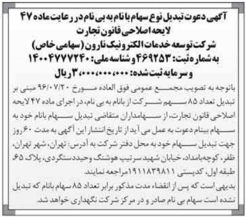آگهی دعوت تبدیل نوع سهام با نام به بی نام شرکت توسعه خدمات الکترونیک نارون سهامی خاص به شماره ثبت و شناسه ملی و سرمایه ثبت شده ریال - با توجه به تصویب مجمع عمومی فوق العاده مورخ مبنی بر تبدیل تعداد 85 سهم شرکت از با نام به بی نام در اجرای ماده 47 لایحه اصلاحی قانون تجارت از سهامداران متقاضی تبدیل سهام با نام خود به سهام بی نام دعوت به عمل می آید از تاریخ انتشار این آگهی به مدت 60 روز جهت تبدیل سهام خود به محل دفتر شرکت به آدرس تهران شهر تهران ظفر مراجعه نمایند - بدیهی است که پس از انقضاء مدت مذکور برابر تعداد 85 سهام با نام که تبدیل نشده است سهام بی نام صادر و در مرکز شرکت نگهداری خواهد شد